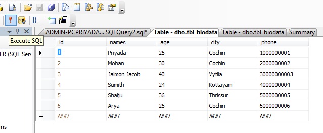 Then exit from the Query window , and come to tbl_biodata, then we can see 5 records are there