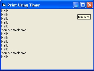 Private Sub Timer1_Timer() Print "Hello" End Sub Private Sub Timer2_Timer() Print "Welcome" End Sub |
